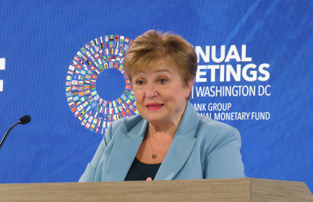 国際通貨基金(IMF)のゲオルギエワ専務理事は16日の記者会見で、人工知能(AI)導入による生産性向上などが、世界の経済成長率を最大0.8ポイント押し上げるとの見通しを明らかにした=ワシントン 【時事通信社】