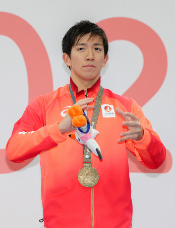 競泳男子200メートル個人メドレーで優勝し、手話で国歌を表現する茨隆太郎。今大会2冠。デフリンピック通算22個目のメダルを手にした=22日、東京アクアティクスセンター 【時事通信社】