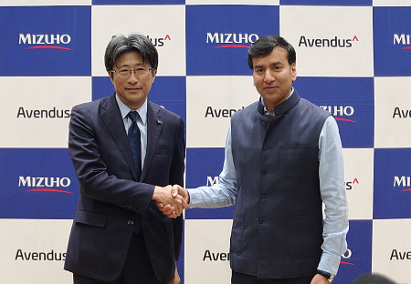みずほフィナンシャルグループ(FG)は17日、インドの大手投資銀行アベンダス・キャピタルを買収すると発表した。写真は、みずほFGの木原正裕社長(左)とアベンダスのディーパックCEO(最高経営責任者)。 【時事通信社】