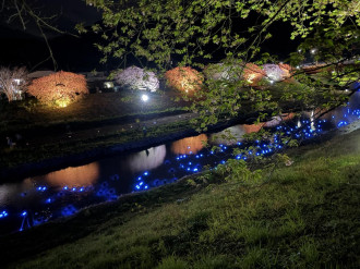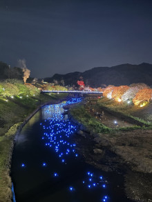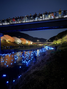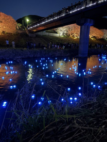 同イベントは、会期終盤を迎えた「みなみの桜と菜の花まつり」の中で、町制施行70周年を記念する特別行事として行われたもの。青野川に「いのり星」と名付けられた青く光るLEDオブジェ3000個を放流し、ライトアップされた夜桜と重なり合う幻想的な景観を生み出した。