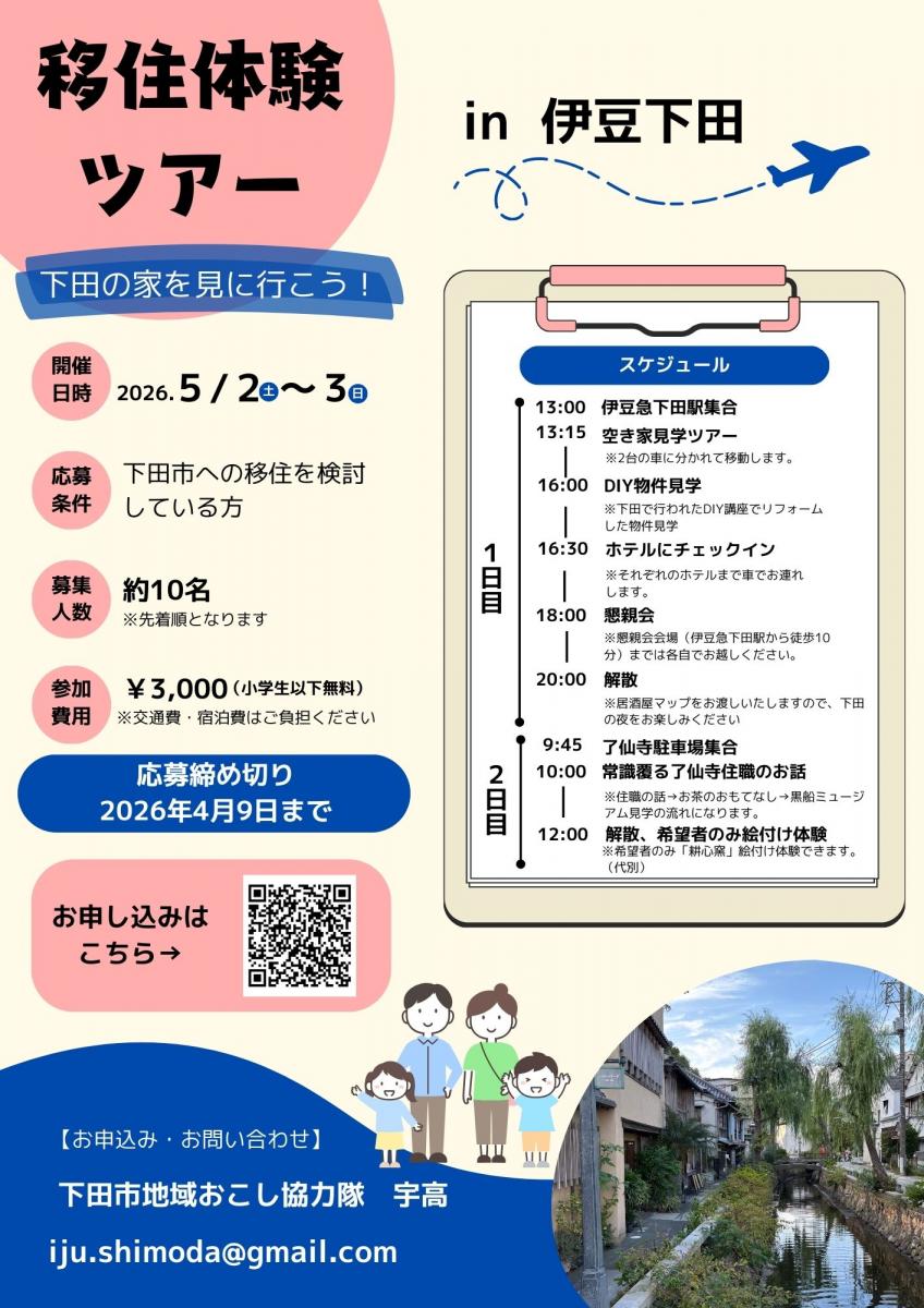 下田市が5月2日・3日、「下田の家を見に行こう!」と題した移住体験ツアーを開く。市内の空き家を巡る内見やDIYによる改修事例の見学を通じ、観光地としての顔だけではない下田の日常に触れる機会を提供することを目指す。