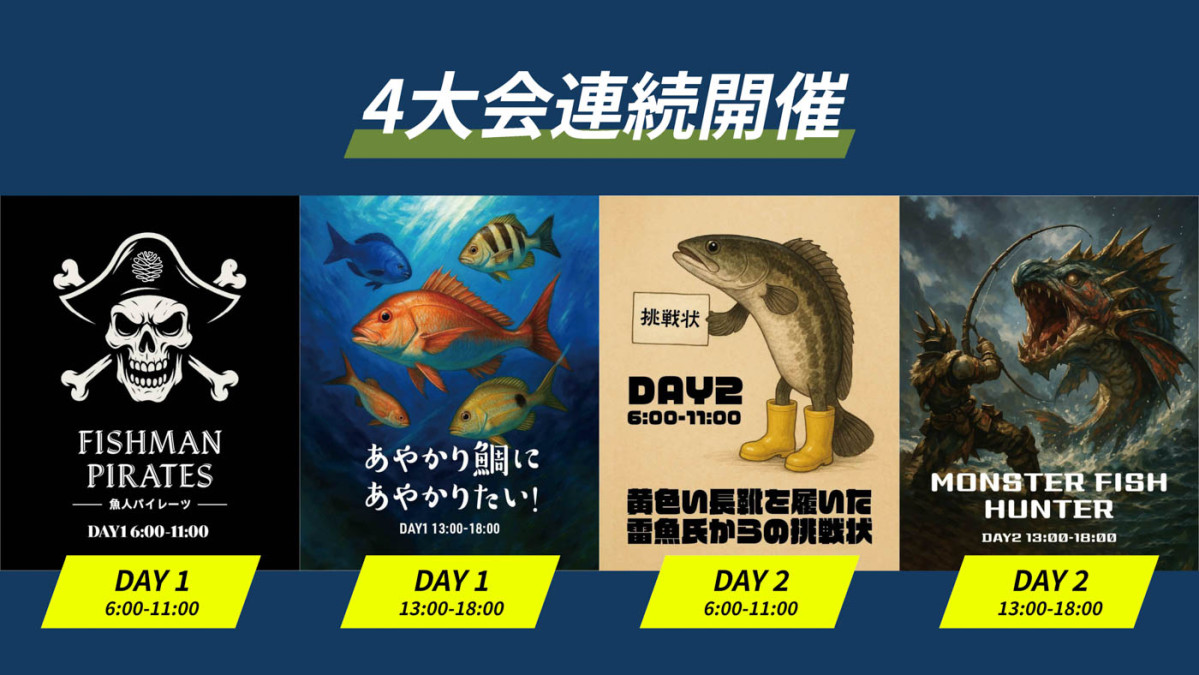 12日6時からの「黄色い長靴を履いた雷魚氏からの挑戦状」は、魚のサイズや名前の文字数、体色など条件をクリアすることでボーナスポイントを獲得するゲーム性の高い大会。12日13時からの「MONSTER FISH HUNTER」は、40センチ以上の「ビッグモンスター」や粘液を持つ「ヌルヌルモンスター」など、特定の条件を満たす魚を釣ることで高ポイントが得られる。