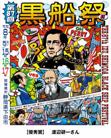 最優秀賞に選ばれた山岡さんの作品では、あえて黒船のビジュアルは用いず、ペリー提督が日本国旗の描かれたのれんをくぐる姿をデザインした。今回の公募を通じて黒船祭を初めて知ったという山岡さんは「自分と同じように黒船祭のことを知らなかった人に向けて、『黒船祭』と『あの黒船』を脳内で結びつけるため、ペリー提督をメインビジュアルに据えた」とコメントしている。