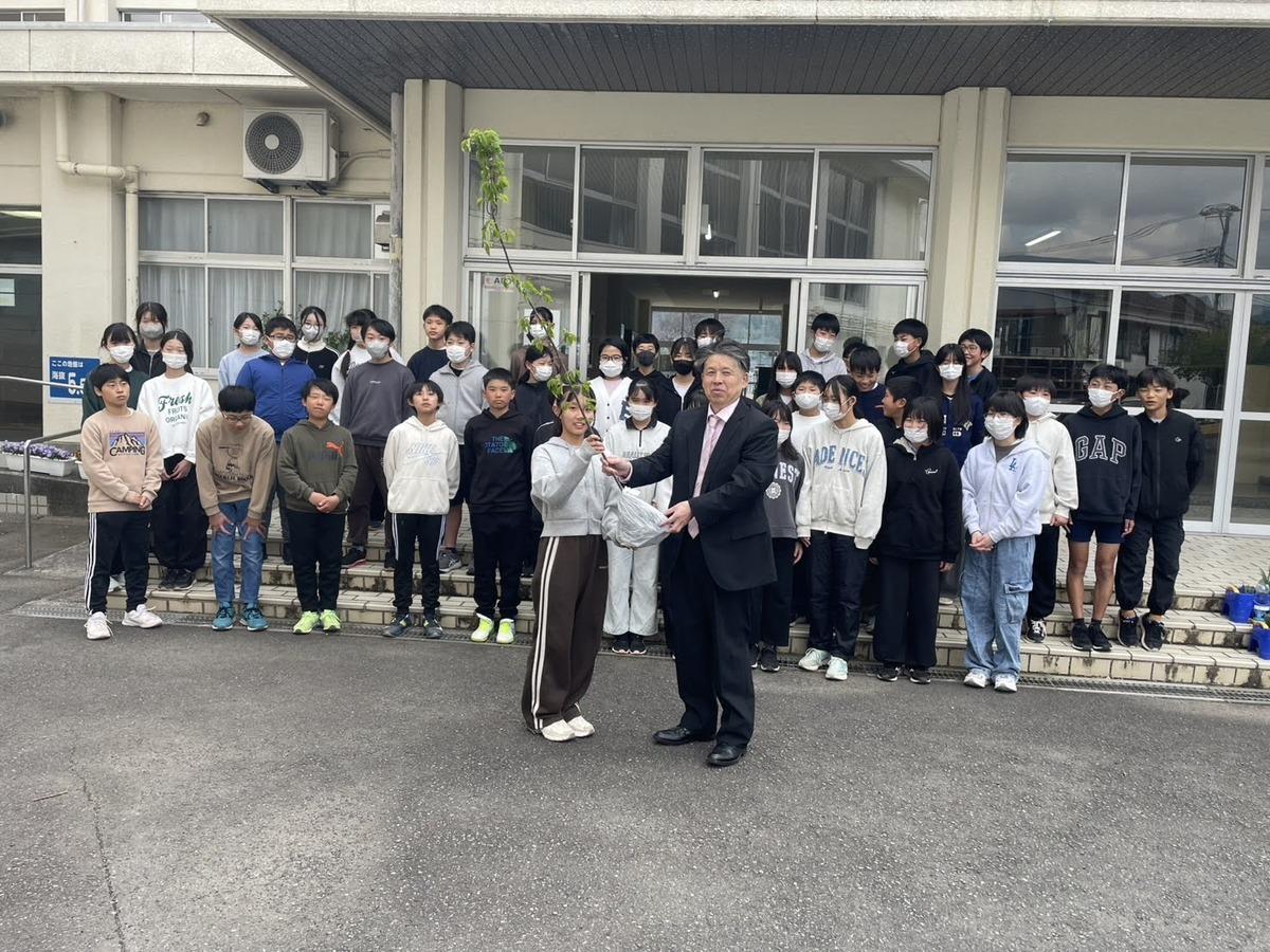 河津町立河津小学校(河津町笹原)で3月12日、卒業を控えた6年生に河津七滝観光協会が河津桜の苗木を贈る贈呈式が行われた。