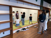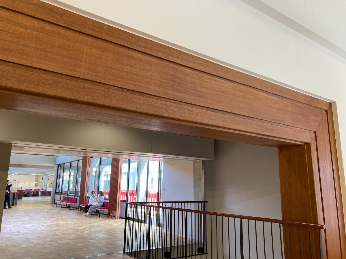体育館ステージの梁(はり)をそのまま使用した入り口