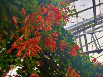 温泉熱を利用してワニの飼育と南国植物の栽培を行う「熱川バナナワニ園」(東伊豆町奈良本)で現在、ツル性植物のカエンカズラが満開を迎え、園内を鮮やかなオレンジ色に染めている。