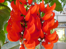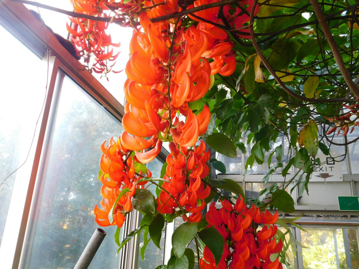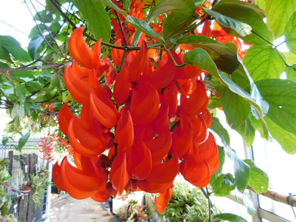 温泉熱を利用してワニの飼育と南国植物の栽培を行う「熱川バナナワニ園」(東伊豆町奈良本)で現在、ツル性植物のオウムカズラの真っ赤な花が満開を迎えている。