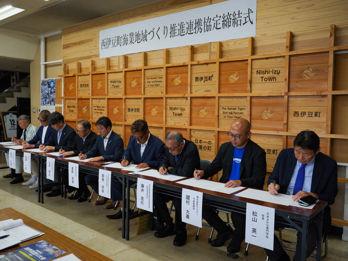 西伊豆町は10月1日、伊豆漁業協同組合(西伊豆町仁科・田子・安良里)、西伊豆町観光協会、ウミゴー(西伊豆町宇久須)、日本さかな専門学校(神奈川県三浦市)、西伊豆産地直売企業組合、日本釣振興会静岡県支部の計8者と「西伊豆町海業地域づくり推進連携協定」を締結した。