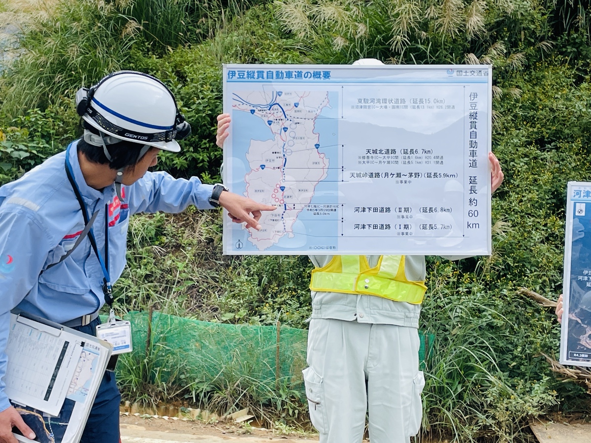 建設が進む伊豆縦貫自動車道の工事の様子を実際に見て理解してもらおうと10月25日、「伊豆縦貫自動車道・親子現場見学会」が開かれた。