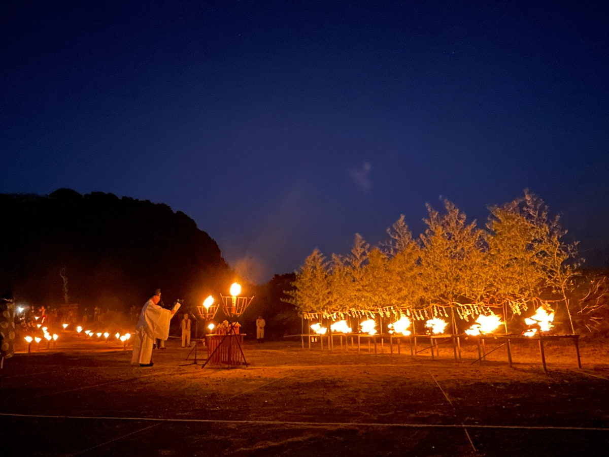 伊豆諸島に向けてかがり火をたき、宮司が祝詞を奏上する(1)