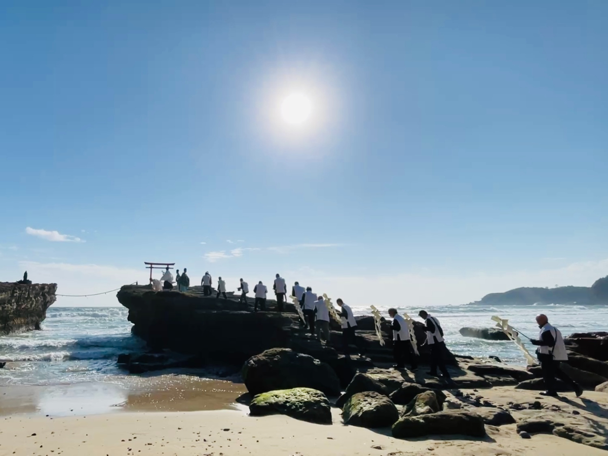 「御弊流祭(おんべながしさい)」のため海岸鳥居のもとへ上がる関係者たち
