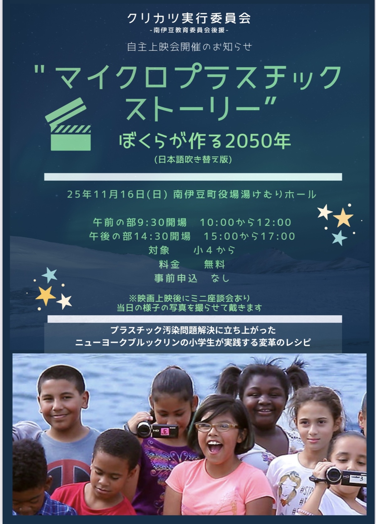 ドキュメンタリー映画「マイクロプラスチック・ストーリー ~ぼくらが作る2050年~」の自主上映会が11月16日、南伊豆町役場内「湯けむりホール」で開催される。