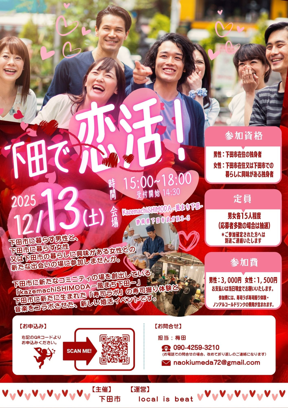 下田市が主催する婚活イベント「下田で恋活!」が12月13日、コミュニティースペース「風まち下田」(下田市武ガ浜)で開かれる。