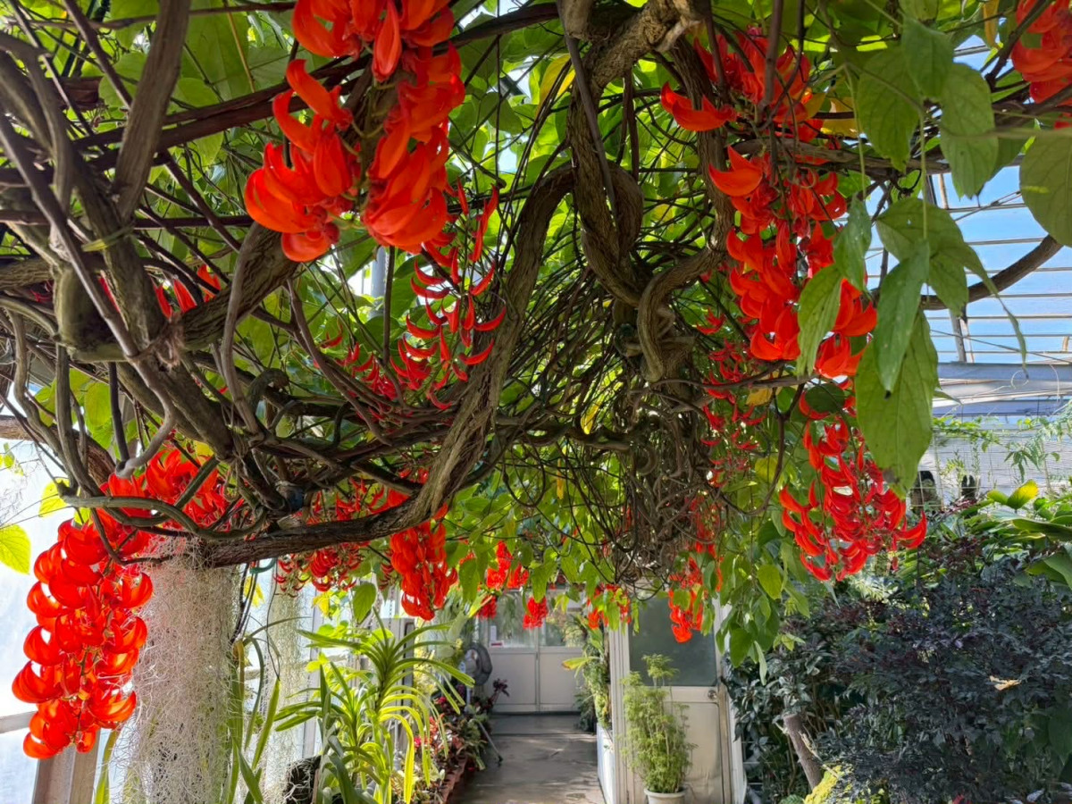 温泉熱を利用してワニの飼育と南国植物の栽培を行う「熱川バナナワニ園」(東伊豆町奈良本)で現在、ツル性植物のオウムカズラの真っ赤な花が満開を迎えている。