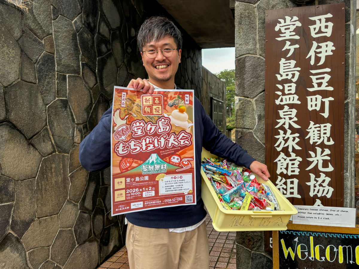 西伊豆町観光協会が1月2日、新年を祝う恒例イベント「新春!堂ヶ島もち投げ大会」を堂ヶ島公園(西伊豆町仁科)で開く。