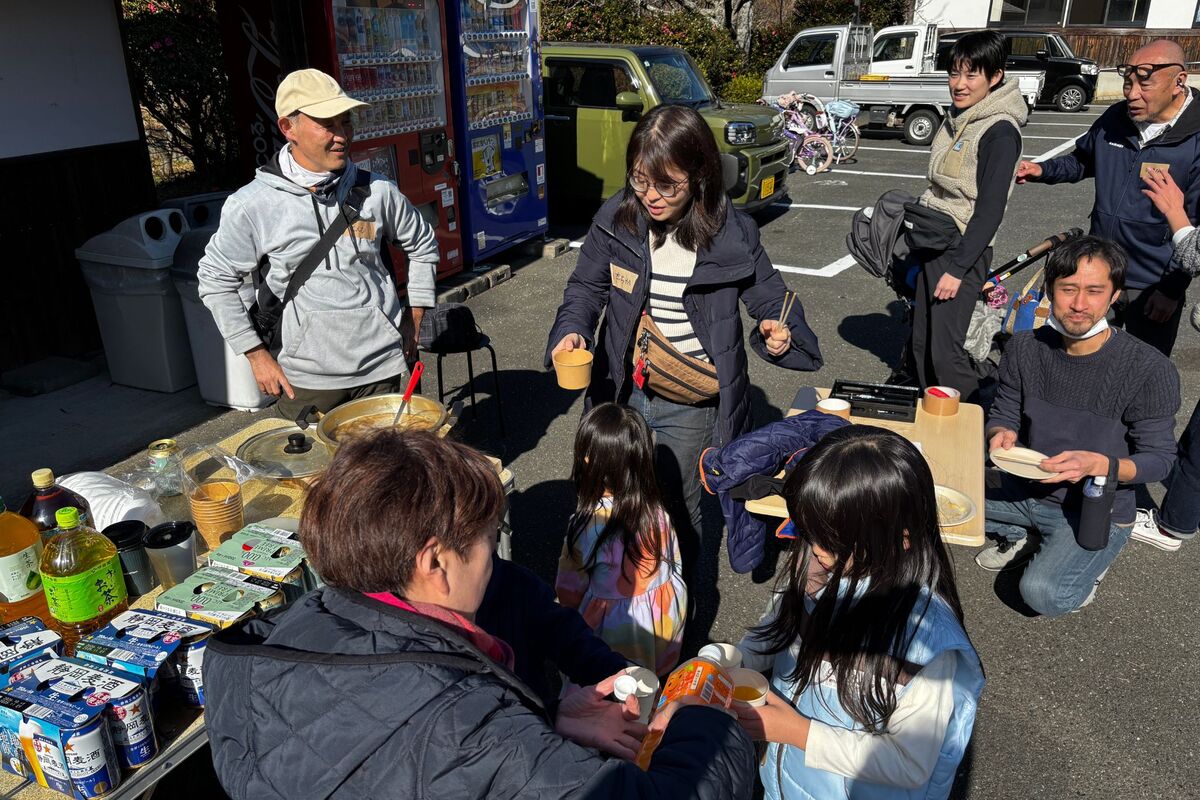松崎町の農家と餅つき交流会を楽しむ参加者たち