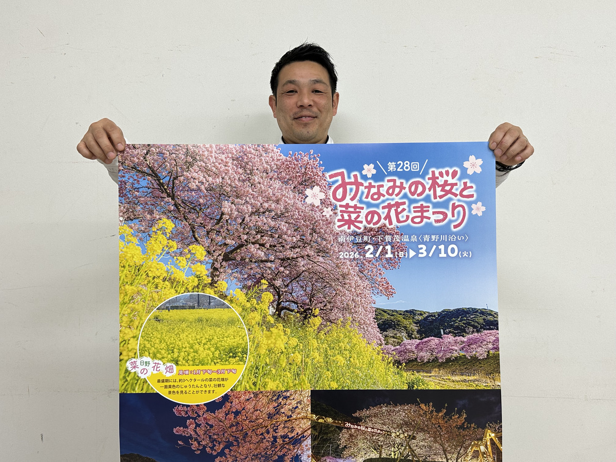 告知ポスターを掲げる南伊豆町観光協会の桑原事務局長