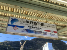下田海中水族館のキャラクターが描かれた駅名看板(2)