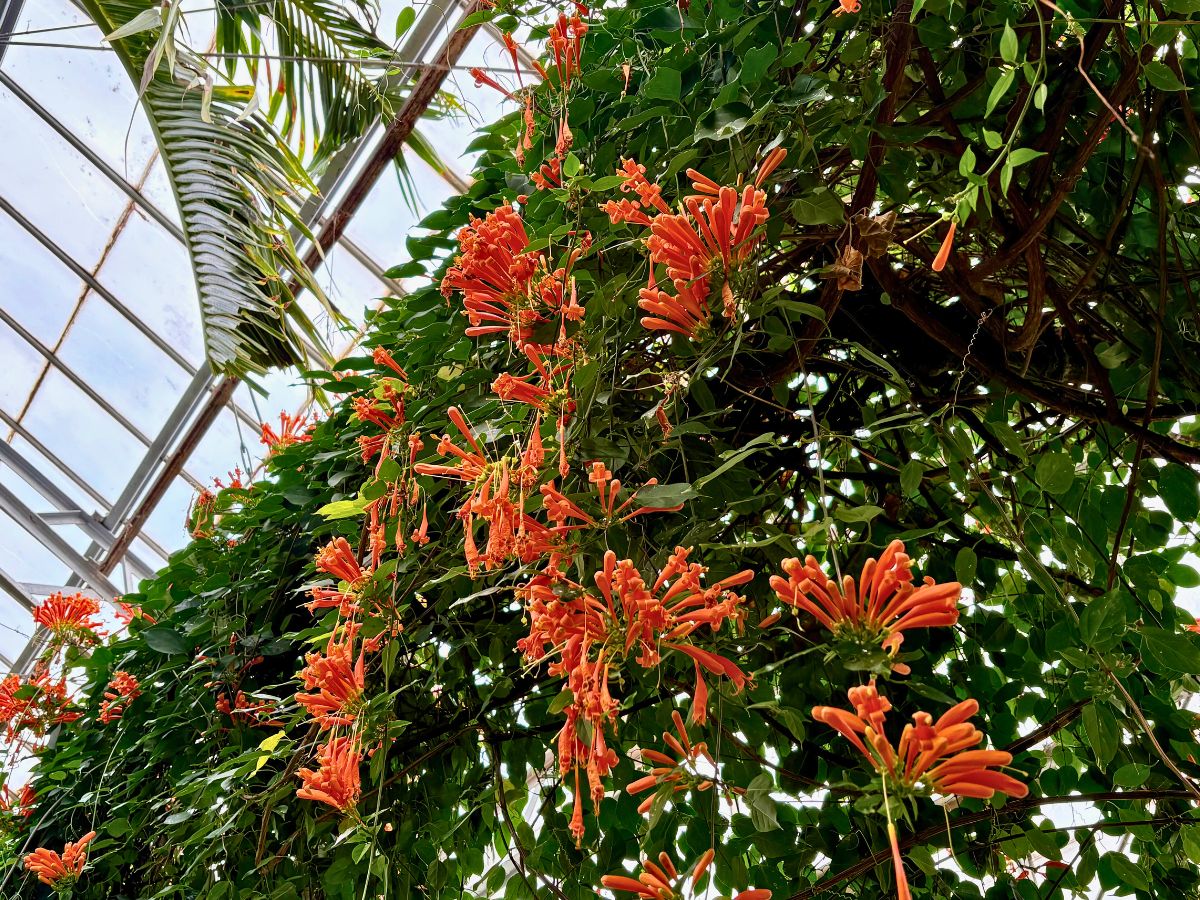 温泉熱を利用してワニの飼育と南国植物の栽培を行う「熱川バナナワニ園」(東伊豆町奈良本)で現在、ツル性植物のカエンカズラが満開を迎え、園内を鮮やかなオレンジ色に染めている。