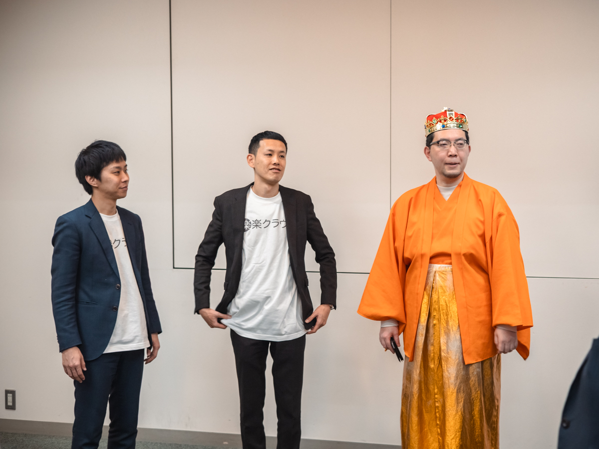 登壇した株式会社ラクスの岩室一八さん(左)と菅谷元さん(中央)、AI国王こと齋藤潤さん(右)