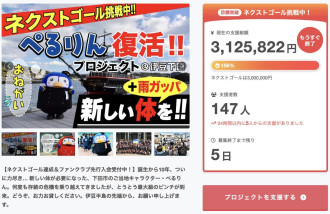 下田市のご当地キャラクター「ぺるりん」の着ぐるみを新調するために行われているクラウドファンディング(以下、CF)が2月21日、当初目標の1.5倍となる300万円を達成した。
