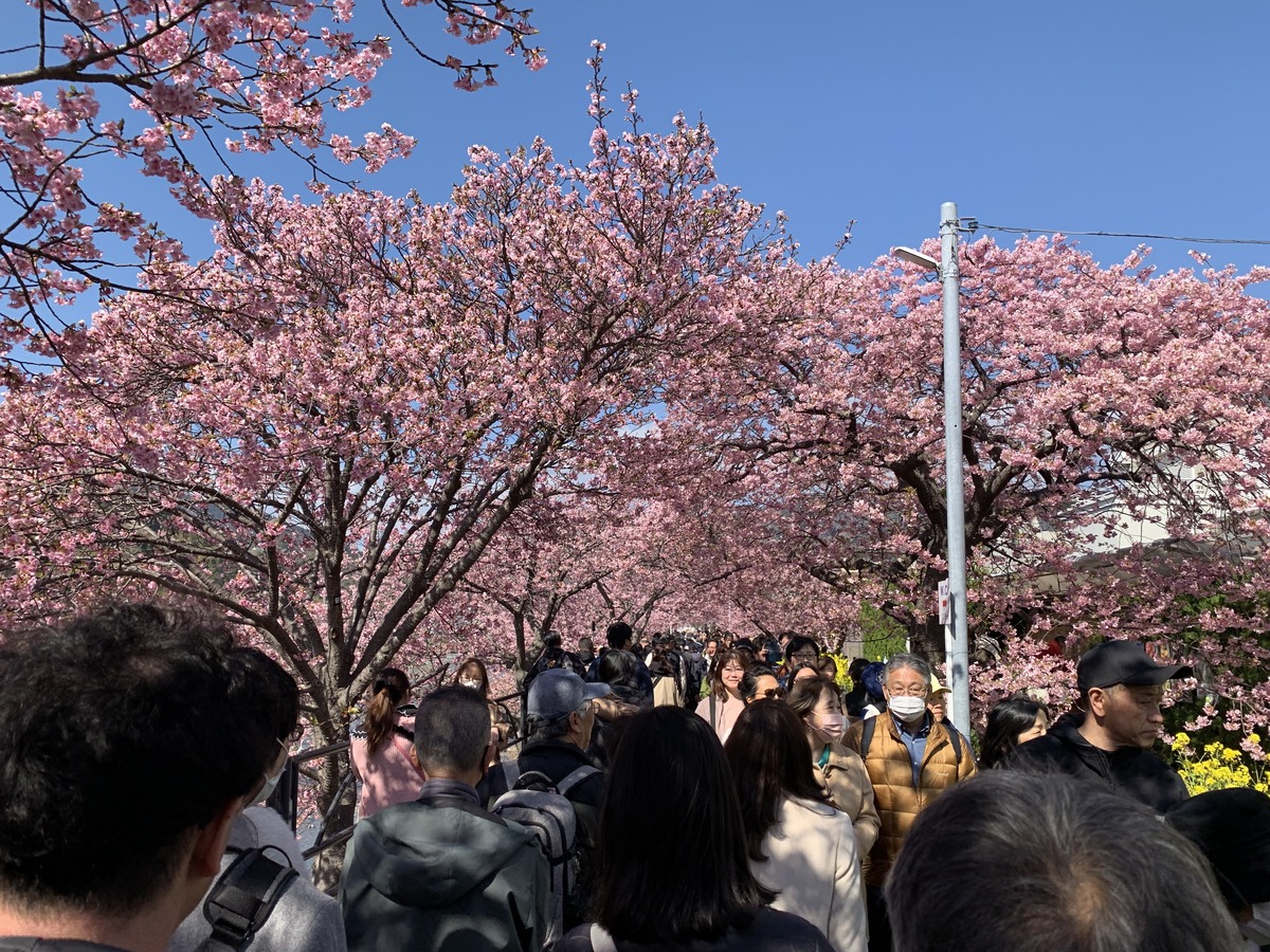 河津町で開催中の「第36回河津桜まつり」で2月21日、河津川沿いの遊歩道の河津桜がほぼ満開を迎えた。