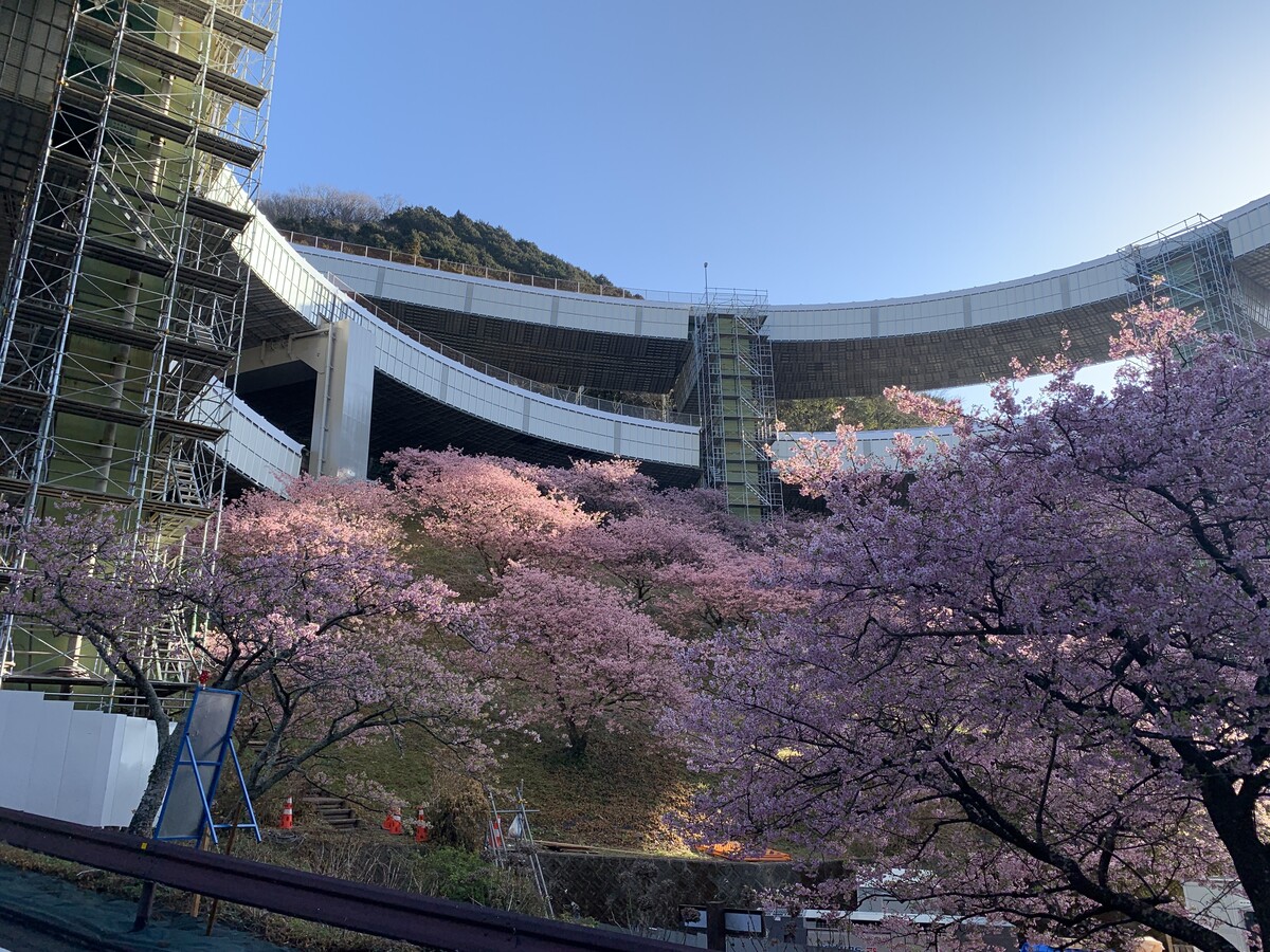 補修工事が進む「河津七滝(ななだる)ループ橋」(河津町梨本)周辺で現在、補強工事中のループ橋と見事に咲く河津桜が一緒に見られる「今だけの風景」が広がっている。