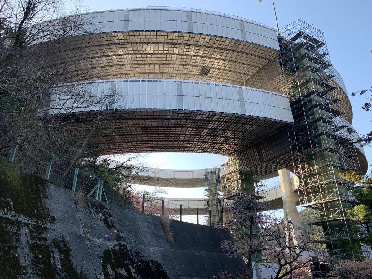 補修工事が進む「河津七滝(ななだる)ループ橋」(河津町梨本)周辺で現在、補強工事中のループ橋と見事に咲く河津桜が一緒に見られる「今だけの風景」が広がっている。