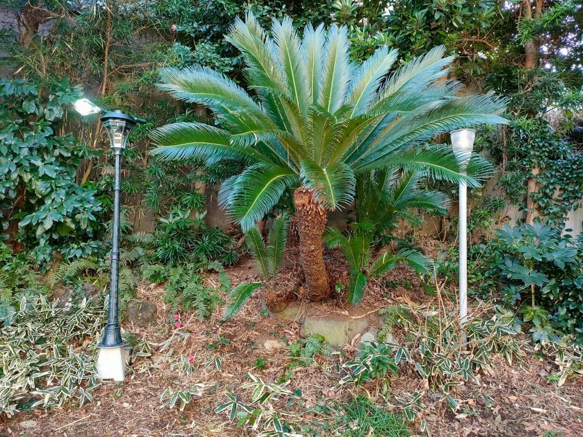 市川平さんの特殊照明作品(左)と古い灯柱(右)
