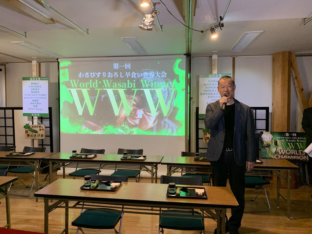 河津町の特産品のワサビの魅力をより多くの人に知ってもらおうと企画された「わさびすりおろし早食い世界大会(World Wasabi Winner)」が3月21日、河津桜観光交流館(河津町笹原)2階で初めて開かれた。