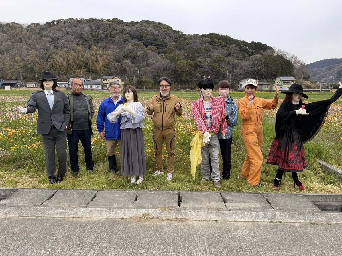 「田んぼをつかった花畑」でのかかし設置の様子(写真提供=松崎花畑実行委員会)