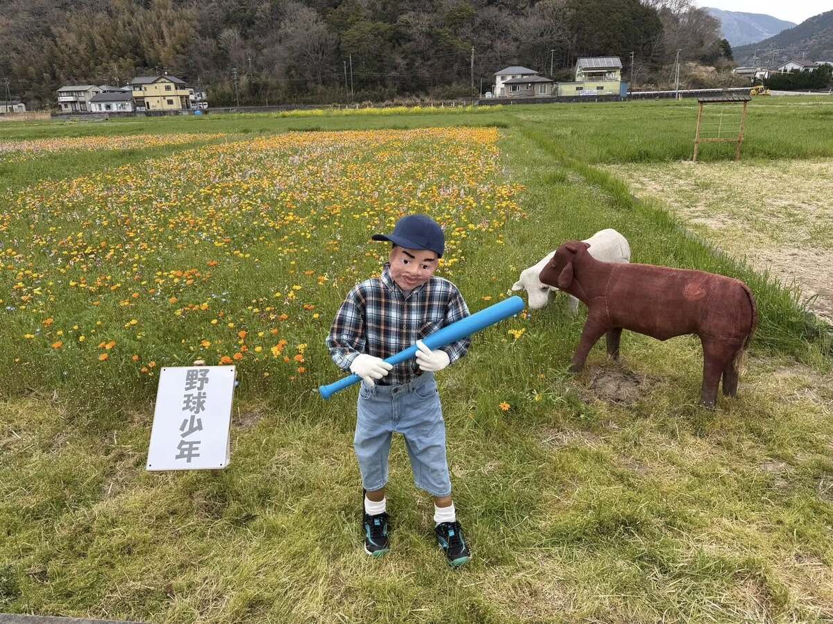 野球少年を模したリアルかかし(写真提供=松崎花畑実行委員会)