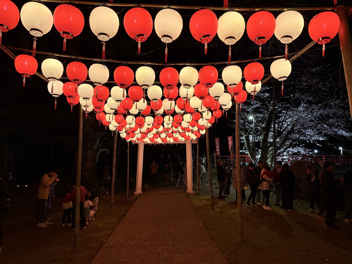 桜並木と神社を幻想的に照らし出す「桜ライトアップ」が3月27日、松崎町の大沢地区で始まった。