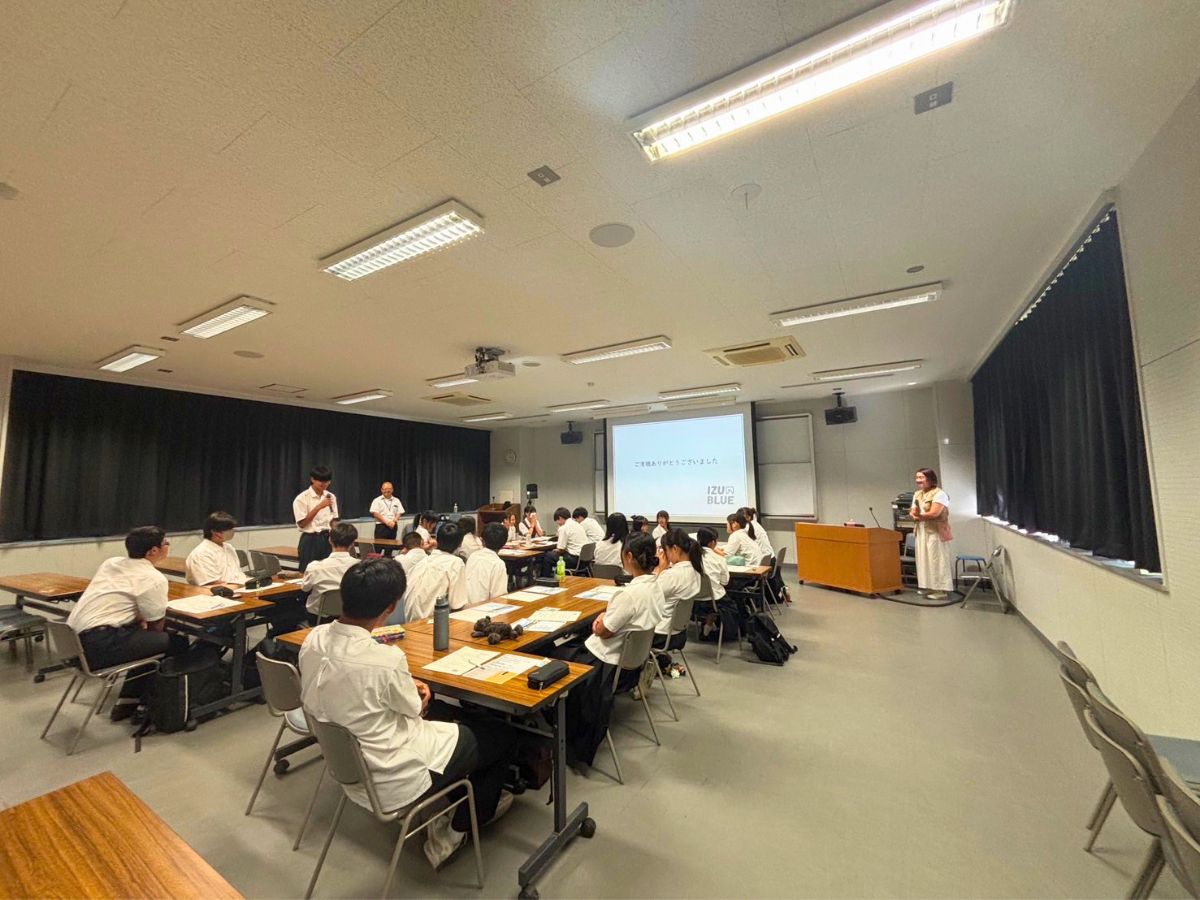 伊豆の青い海や空をイメージしたデザインを手がけるアパレルブランド「IZUBLUE」が4月1日、地域の高校生たちに向けた職業講座から誕生したチャリティーTシャツの販売を始めた。
