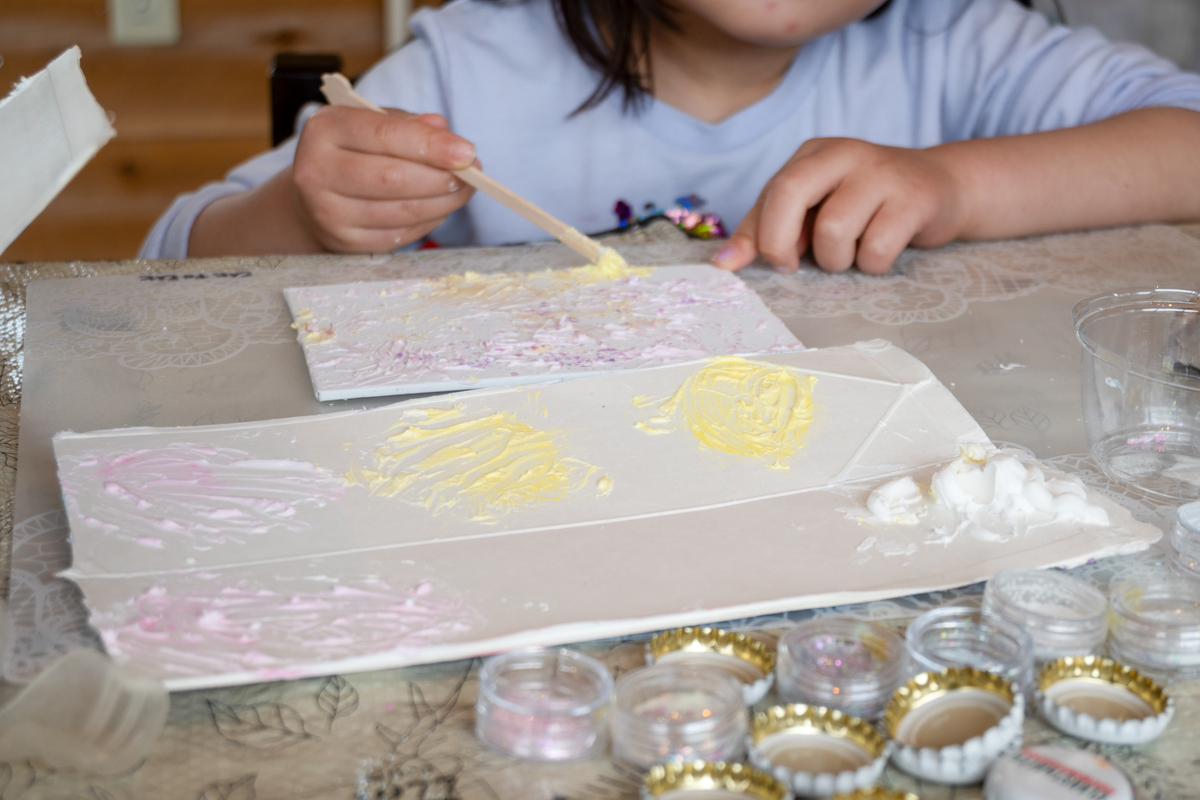 下田の海で拾った貝殻を使った「テクスチャーアート」ワークショップの様子