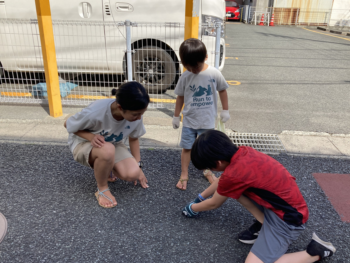 ごみを拾う親子